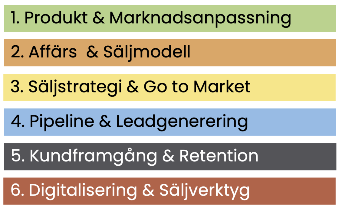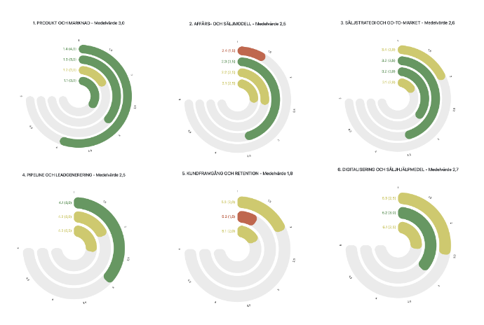 Hur fungerar det i praktiken? Genom att analysera sex nyckelområden kartläggs bolagets sälj - och tillväxtmognad. Nyckelpersoner, styrelse och ägare svarar på strukturerade frågor i en kvalitetssäkrad och viktad metod. Detta görs via bolagets insiktspanel i dialogform alternativt online.